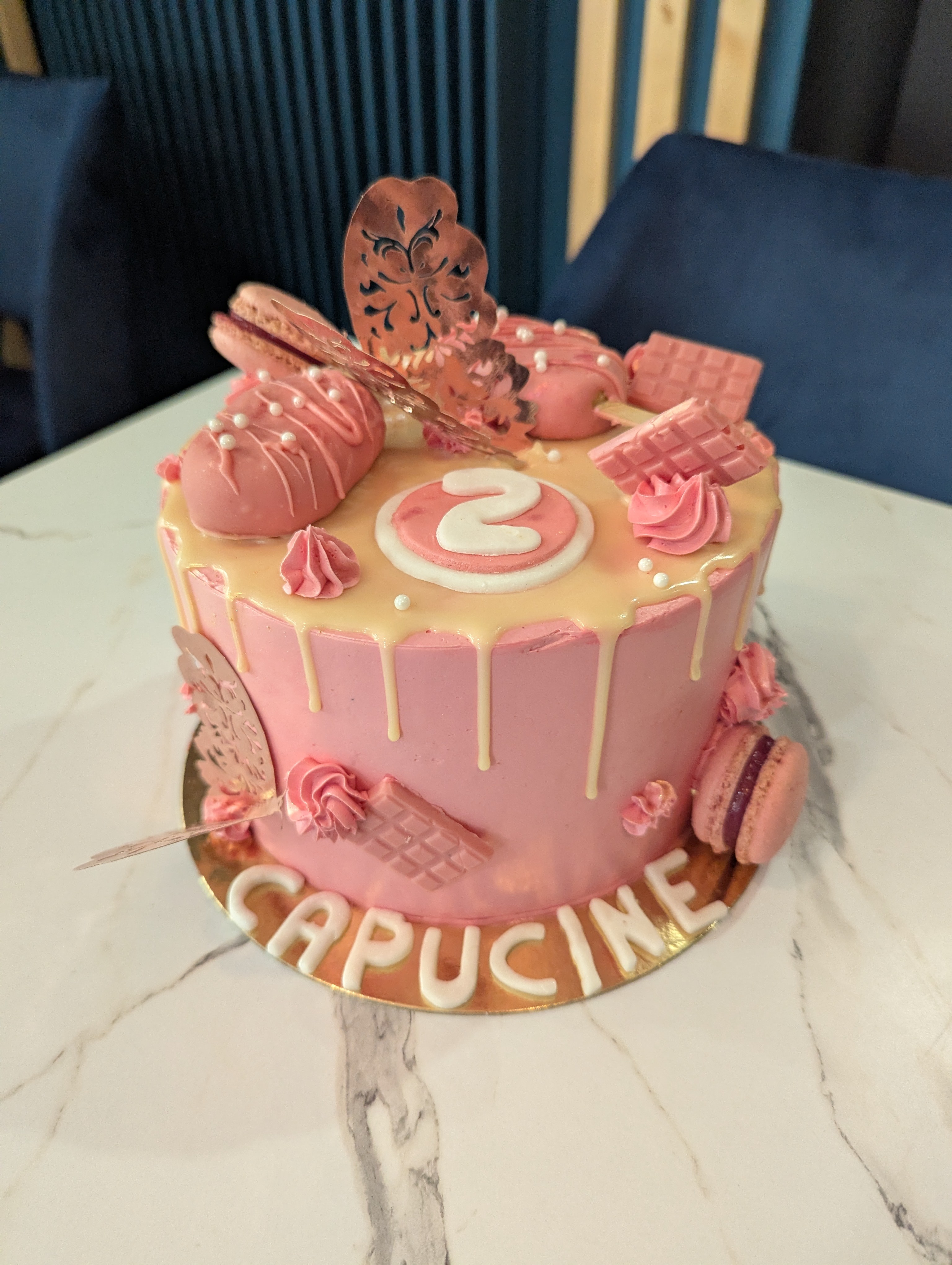 Notre cake design drip cake est composé de génoise nature ou cacao et d'une mousse au choix (mousse chocolat au lait, caramel, vanille, avec ou sans des fruits...).