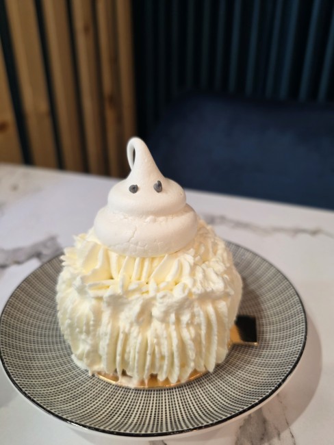 Forêt blanche composée de génoise,  creme vanille et chantilly surmontée d'une meringue fantôme.